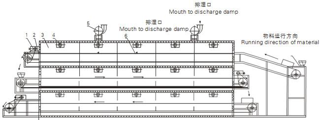 Materials will have to deal with appropriate material body shop, such as star distributor, swing band, mill or machine-made materials, located in the conveyor, the conveyor belt through a heating unit composed of one or several channels, each heating units are equipped with heating and air circulation system, each channel has one or several Moisture system, conveyor belt through, the hot air from the top down or bottom-up through the material on the conveyor belt, so that the material evenly dry.